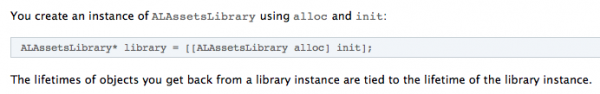 The last sentence is key, “The lifetimes of objects you get back from a library instance are tied to the life of the library instance.” If we release our library instance right there we aren’t going to have access to any of the objects we get back from it anymore! This is new behavior in iOS 5. To adapt to it I just moved the library variable out to be an instance variable of the class and didn’t release it until dealloc is called.
